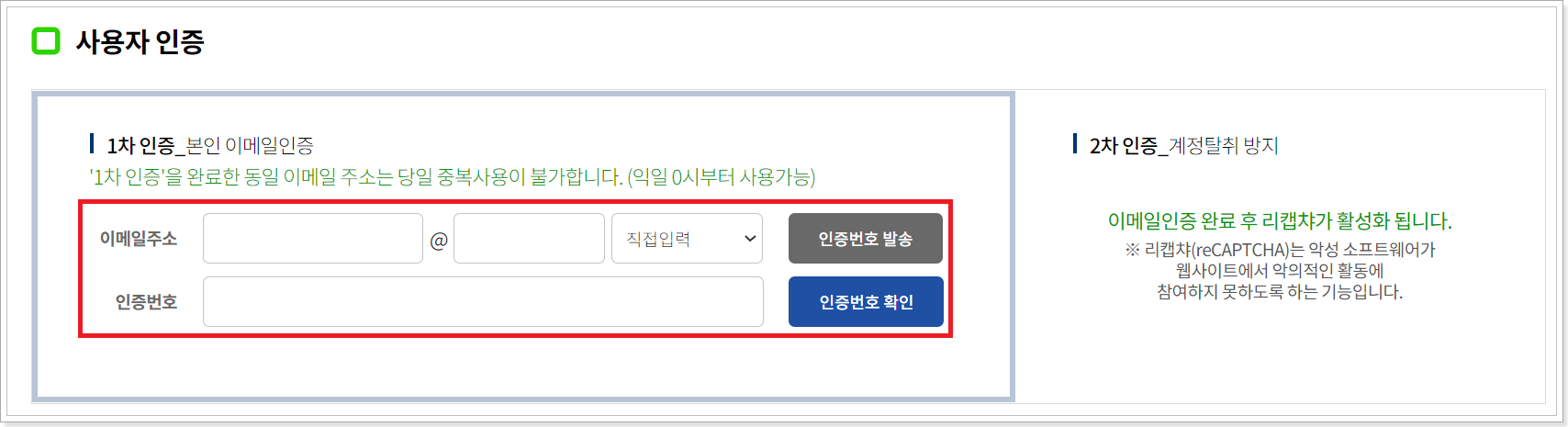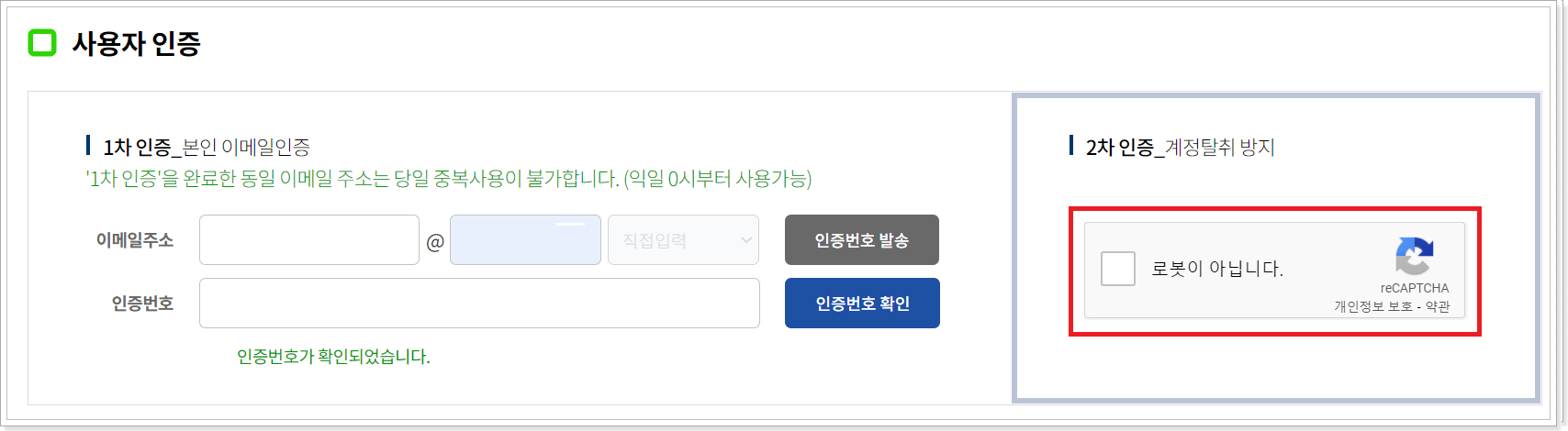 5. 리캡챠를 통해 2차 인증을 합니다.