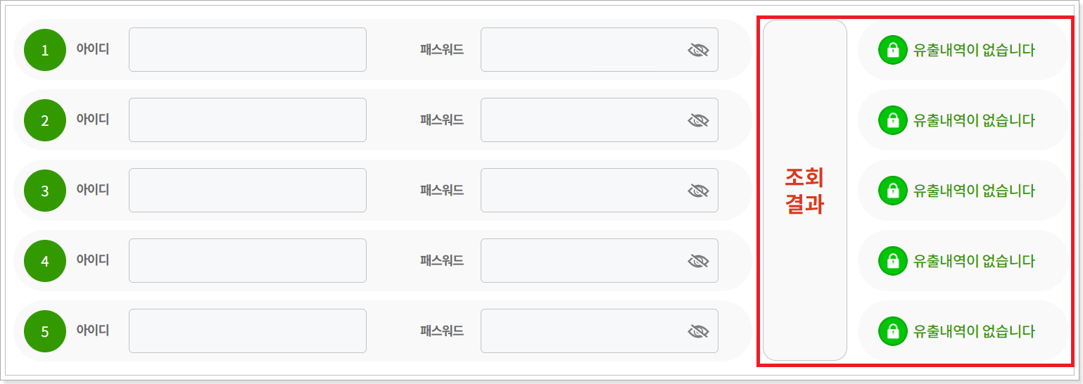 o 본 서비스는 사용자가 입력하는 계정정보(ID,PW)가 유출이력 여부를 조회 및 확인할 수 있도록 결과를 제공하고 있습니다.