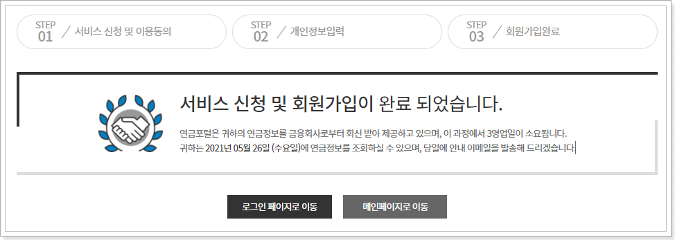 7. 회원가입이 완료되면 약 3영업일 뒤에 연금정보를 조회할 수가 있습니다.