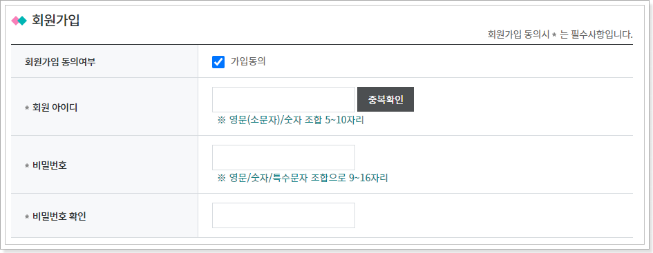8. 회원가입 동의 여부와 아이디, 비밀번호를 정합니다.