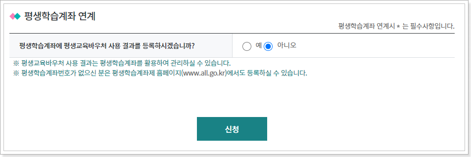 9. 평생학습계좌 연계 여부를 체크하고 신청버튼을 클릭합니다.
