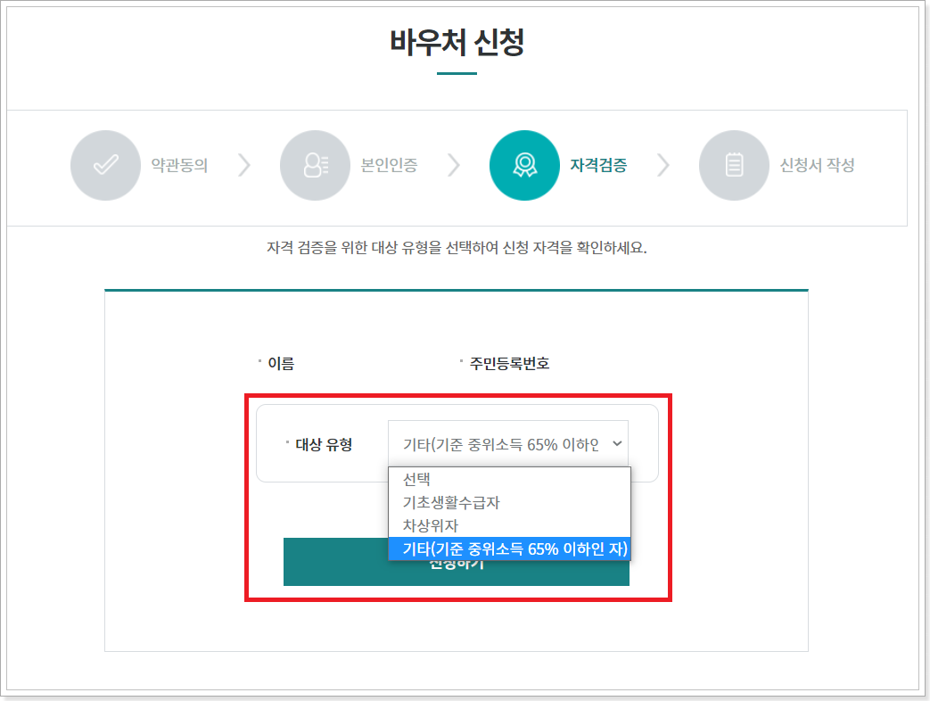 5. 대상유형을 선택하고 신청하기를 클릭합니다.