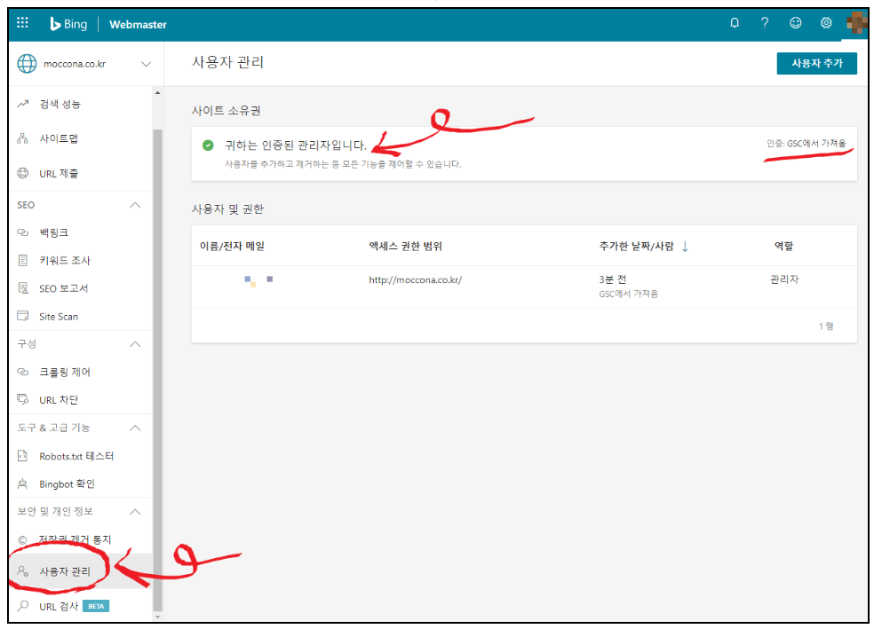 모든 과정이 완료되면 빙 웹마스터 도구 화면으로 이동 됩니다. "사용자 관리"에서 "사이트 소유권"이 제대로 등록이 되었는지 확인해주시면 됩니다.