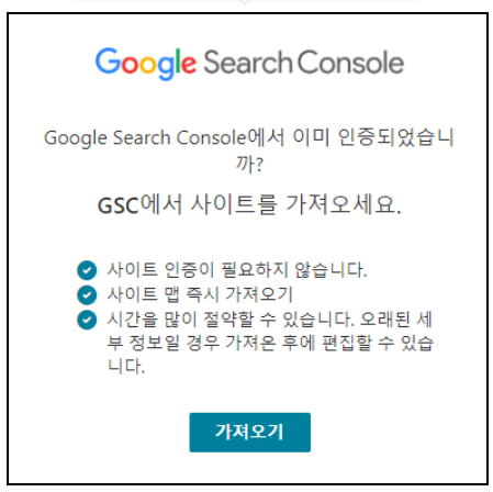 저는 구글 콘솔이 등록이 되어있기 때문에 구글서치콘솔에서 가져오기를 해주겠습니다. 이미 제출된 "Site map"과 "RSS"도 가져오게 되므로 굉장히 편리합니다.