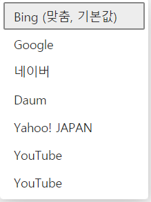 "검색 주소창에 사용된 검색 엔진" 옵션이 Bing (맞춤, 기본값)으로 되어있는 것을 확인하실 수가 있습니다. 눌러주면 구글, 네이버, 다음, 야후제펜, 유튜브 옵션이 있습니다. 저는 Daum으로 변경 해주겠습니다.
