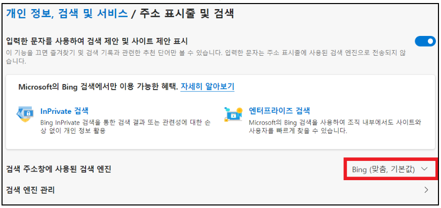 왼쪽 메뉴의 "설정" 트리 중에서 "개인정보, 검색 및 서비스" 를 눌러 진입해 줍니다. 그리고 가장 아래로 스크롤을 내려 주시면 "주소 표시줄 및 검색" 옵션을 찾을 수 있습니다.