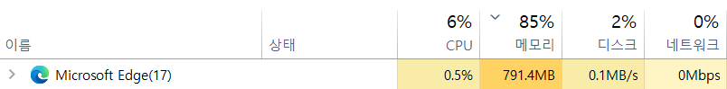 크롬과 동일한 단점이 바로 RAM을 굉장히 많이 사용한다는 점입니다. 제가 좀 많이 열어놓긴 했지만 그래도 어마어마하게 잡아 먹고 있음을 알 수가 있습니다.