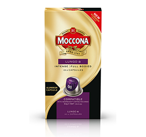 * A combination of quality Arabica and intense Robusta, Moccona Lungo 8 espresso capsules are packed with 100% roast and ground coffee beans and sealed in an aluminium capsule to lock in the freshness. This blend unfolds as an intense, full-bodied Lungo with a depth of flavour throughout.