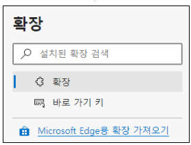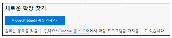 왼쪽 메뉴 혹은 아래에서 Microsoft Edge용 확장 가져오기를 눌러줍니다. Chrome 웹 스토어에서도 가져올 수가 있습니다. 참고로 엣지에서는 일부를 제외하고 구글크롬과 거의 동일한 확장프로그램을 사용할 수가 있습니다.