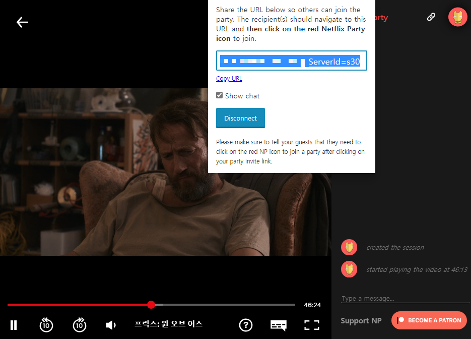 하지만 주소를 받는 사람도 Netflix Party 확장 프로그램을 설치해야만 해당 서비스를 이용할 수 있다는 점은 조금 아쉽습니다.
