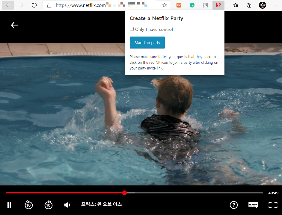 넷플릭스로 접속하면 빨간색으로 바뀌면서 활성화가 되게 됩니다. 원하는 영상을 재생시작 해주세요. 영상 재생이 시작되고 NP 아이콘을 눌러주면 넷플릭스파티를 생성할 것인지 묻는 팝업차이 뜨게 됩니다.