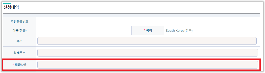 5. 신청내역에서 기본정보를 확인후 발급사유를 입력합니다.