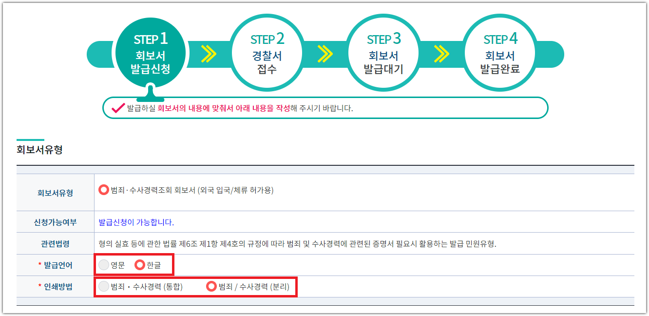 4. 발급언어와 인쇄방법을 선택합니다. 범죄ㆍ수사경력을 통합하거나 분리하여 인쇄가능합니다. 1