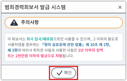 예를들어 외국 입국이나 체류용으로 범죄경력회보서를 발급받은 경우, 원래 목적이외의 다른 목적용도로 범죄회보서를 사용하는 경우 취득자, 사용자 모두 법에 따라 처벌될 수 있음을 확인해야합니다.