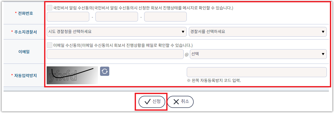 6. 전화번호와 주소지 경찰서를 입력후, 자동입렵방지를 입력하고 신청하기 버튼을 클릭합니다.