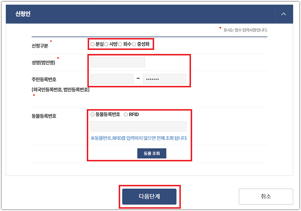 6. 신청구분, 이름 그리고 동물등록번호를 입력 후 다음단계를 클릭합니다.