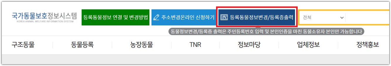 2. 홈페이지 상단에서 등록동물정보변경 및 등록증 출력 메뉴에서 신고가능합니다.