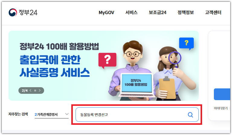 2. 동물등록 변경신고를 검색합니다.