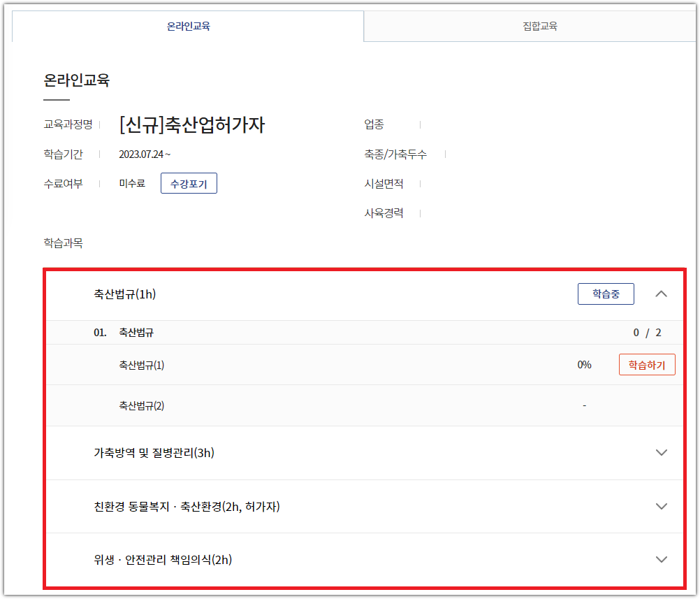 축산업종에 종사하는 사람은 축산법에 따라서 의무적으로 축산종사자교육을 신청하여 이수해야합니다. 신규로 시작하는 축산업 신규 허가자는 24시간의 교육을 수강해야합니다. 그리고 매년 6시간의 보수교육을 들어야합니다.