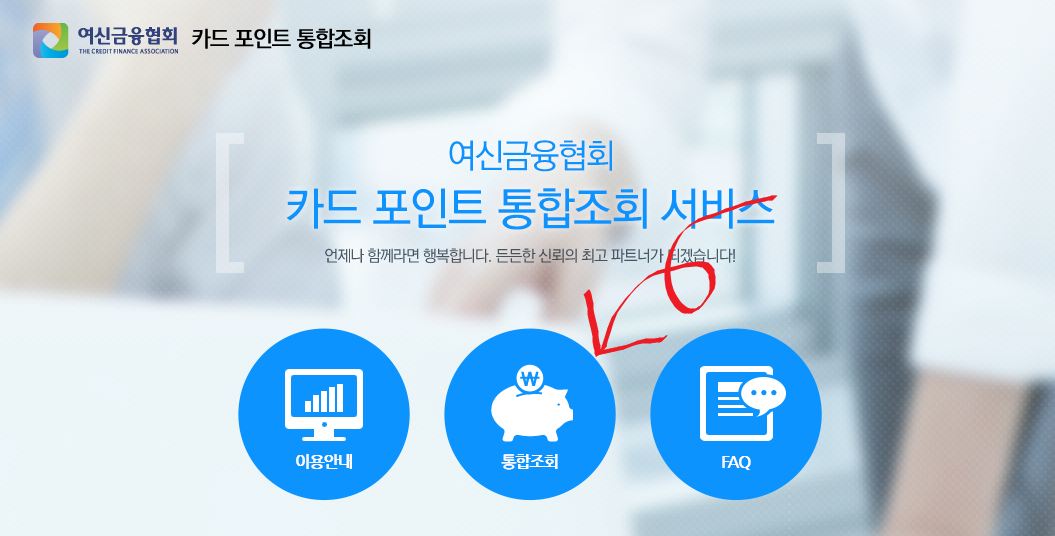 우선 여신금융협회로 들어가면 카드포인트를 조회할 수가 있다. 내가 내 명의로 소유하고 있는 모든 카드포인트를 조회할 수가 있게 되니 굉장히 편리하다. 우선 사이트에 접속 후, 통합조회를 눌러줍니다.