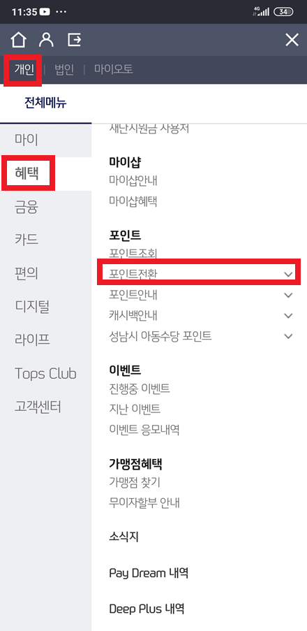 포인트는 계좌로 송금할 수가 있습니다. 우선 신한카드 앱에서 접속하게 되는 경우 메뉴>혜택>포인트전환으로 접속하면 됩니다.